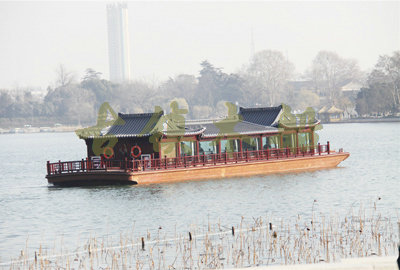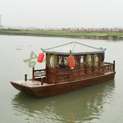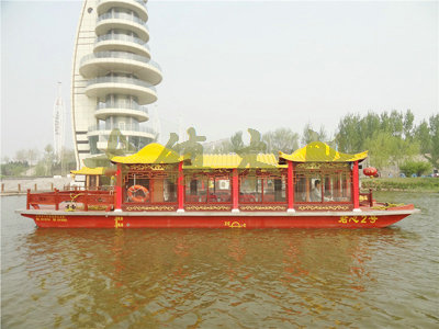 畫舫船就是裝飾古典華麗的游船,是"中國風(fēng)"的仿古游船,結(jié)合古典園林建筑,體現(xiàn)了中華文明的古典藝術(shù).畫舫船豪華而又古典,船上的建筑按照中國古代建筑里的亭臺(tái)樓閣,建筑工藝之復(fù)雜,要求之嚴(yán)格,仿古畫舫游船的特點(diǎn)飛檐翹角、玲瓏精致的四角亭子逐漸成形,赫然立于船頭,美人靠、盤龍柱子、彩畫……龍柱上的浮雕盤龍和祥云一層扣著一層,層層錯(cuò)落有致,雕刻精細(xì)到盤龍身上的每一個(gè)鱗片都細(xì)細(xì)可數(shù),古代皇家標(biāo)志性元素,在畫舫船上體現(xiàn)的淋漓盡致。除了雕刻、花窗,整條船還有一個(gè)看點(diǎn),那就是弧線優(yōu)美、高高翹起的船尾。游船并不大,長約10米、寬3米,但是整體看起來堪稱一件藝術(shù)品。船尾的雕花欄桿與船艙、船頭的雕刻遙相呼應(yīng),船身四周貼著浮雕祥云,給整條船增添了富貴、華麗的氣質(zhì)。